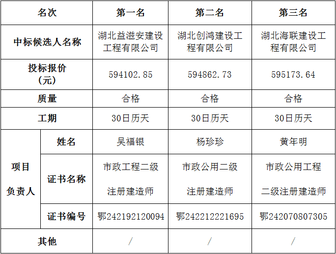 金松集團(tuán)創(chuàng)衛(wèi)環(huán)境整治項(xiàng)目(同心路交江城大道東北角優(yōu)化)于2023年01月18日在湖北松滋金松投資控股集團(tuán)有限公司開標(biāo)室開標(biāo),并于2023年01月18日完成評標(biāo)工作。根據(jù)評標(biāo)委員會(huì)提交的評標(biāo)報(bào)告,湖北松滋金松投資控股集團(tuán)有限公司已經(jīng)確認(rèn)評標(biāo)結(jié)果,現(xiàn)進(jìn)行評標(biāo)結(jié)果公示。