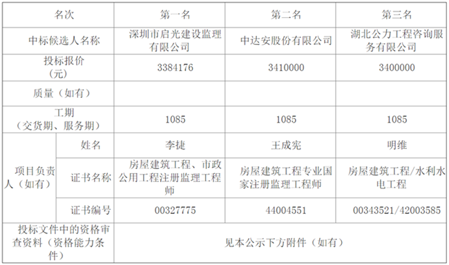 松滋市金投·新城壹品建設項目第三標段監(jiān)理松滋市金投·新城壹品建設項目第三標段監(jiān)理于2019年09月04日在湖北省電子招投標交易平臺發(fā)布招標公告,2019年09月27日在開標室(1)開標,并于2019年09月27日完成評標工作。根據(jù)評標委員會提交的評標報告,湖北松滋金投置業(yè)有限公司已經(jīng)確認評標結果,現(xiàn)進行評標結果公示。
